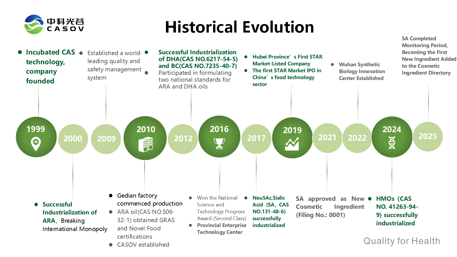 A Wuhan CASOV Green Biotech Co., Ltd., subsidiária integral do CABIO Group (código de ações: 688089), listada no STAR Market, aproveita os recursos tecnológicos da Academia Chinesa de Ciências e um moderno sistema de P&D para se concentrar em biofermentação, desenvolvimento de ingredientes funcionais e aplicações. Reconhecida como "Empresa Nacional de Alta Tecnologia" em outubro de 2014, a empresa opera como o Centro Provincial de Inovação em Tecnologia Industrial e Bioengenharia de Hubei e a entidade gestora do Centro de Melhoramento Biológico da Academia Chinesa de Ciências, mantendo uma profunda colaboração com a equipe de pesquisa sênior dos Institutos de Ciências Físicas de Hefei da Academia Chinesa de Ciências para impulsionar a inovação tecnológica contínua.
